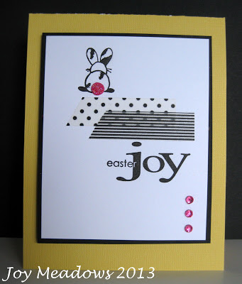 The yellow base card is much brighter IRL! I love this cute little bunny from Magenta that I have had for many years. The sentiment is from Penny Black. I used a regular hole punch to punch the bunny's tail from cardstock that I colored with picked raspberry distress ink. Added snowflake Stickles for some sparkle.