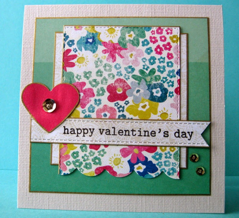 I used patterned papers that were sent to me in a giveaway; don't know what company they are from. The dies used were from MFT: a STAX stitched rectangle for the floral panel and the scalloped frame die and the stitched border from Blueprints #1 were used for the bottom border trim and the flagged sentiment strip. The heart is an old EK Success punch. I used a Pilot gold pen to edge the layers and added platinum Stickles to the centers of the gold sequins that were purchased at Walmart. Sentiment is from Winnie & Walter Big, Bold and Happy set.